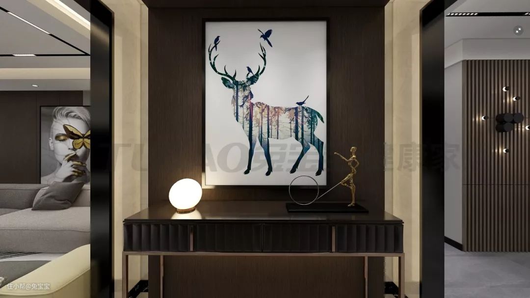 开门进来,可以看到门厅处是端景台的设计,缓冲了进门的视线。且进门即是风景,也让空间在格调上有巨大提升。