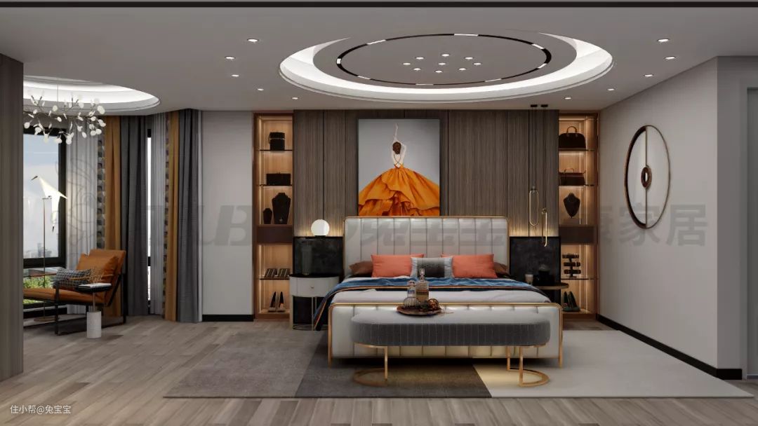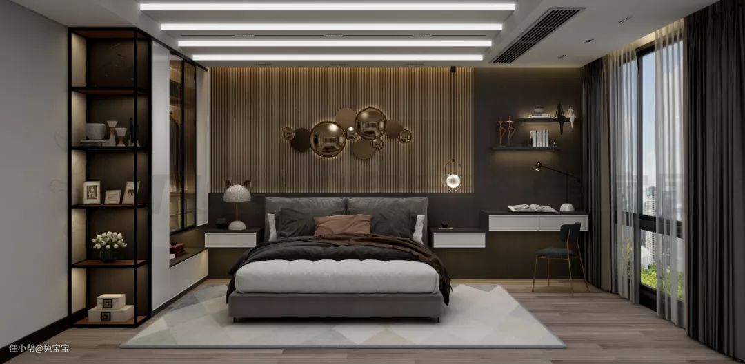 主卧空间很大,不规则的户型样式为卧室空间带来更多的可能性。床头背景墙是木饰面+竖排吊柜展示的造型,加入暗藏的灯带光源,显得层次感更加强烈。白色的皮艺床与金属的细节勾勒,显得更加现代优雅而高级。