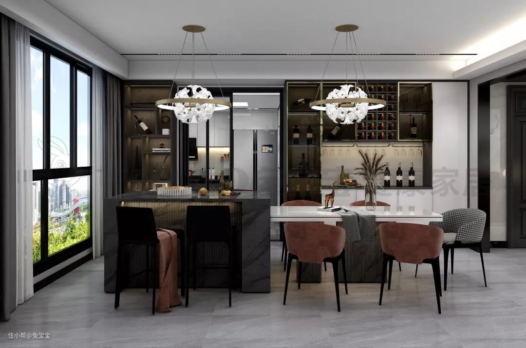 用餐空间是岛台+餐桌的样式,为用餐带来不一样的氛围感。同时添加岛台的设计,也可以充当西厨的功效,让简餐水果等不再完全依赖厨房空间,可谓十分实用了!