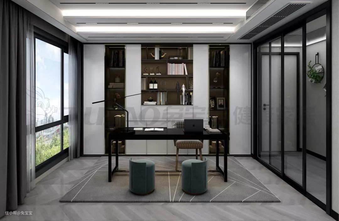 书房以对称样式设计,对称平衡的美感油然而生。整墙的书柜设计,储物能力直线上升,加上半开放式的设计,轻松做到收纳展示两不误。大面积白色柜门结合温润木质,一种安静、平和翩然而至,营造更适宜的书房氛围。
