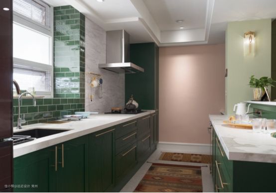 在美式厨房中,色彩和整体色调一般来说现代美式厨房用色十分明亮大量的运用到了一些比较跳脱的颜色,比如克莱因蓝,薄荷绿,这些明亮对比色强烈的颜色,跟白色的石材桌面一对比,美式那种自然田园又带有稍微复古的感觉就出来了。
