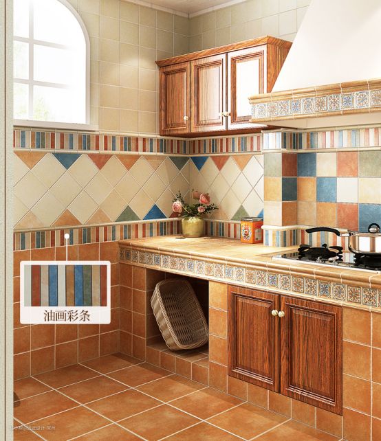 地面或墙面使用不同质感、图案的磁砖打造视觉亮点,像是在地坪=面使用复古花砖,在墙面铺贴铁道砖(地铁砖)点出些许乡村风韵味,在防溅牆使用薄板砖带出现代感,搭配人字贴、编织贴等不同贴法,即能展演出内涵丰富的厨房表情。