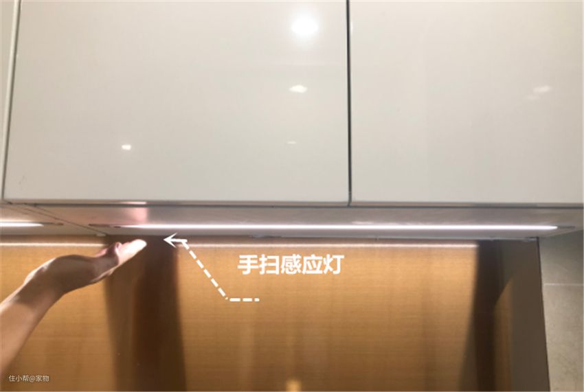 橱柜底部记得装照明设备,弥补做饭切菜区域光线不足的问题。可以直接嵌入灯带,也可安装手扫感应灯,让做饭更舒心。