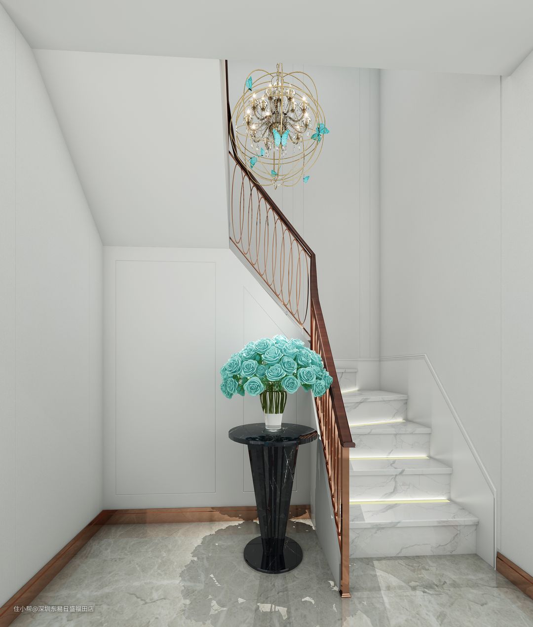 公共区域的墙面是由护墙板跟壁纸的结合,整个背景就出现了三种颜色,对于不是很大的空间来说,刻意的分区,会显得层次过于复杂。