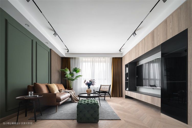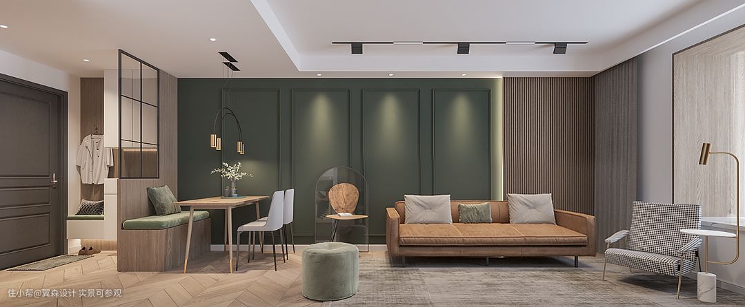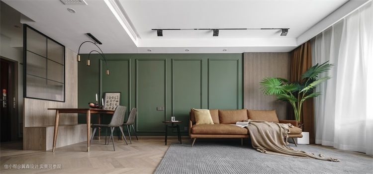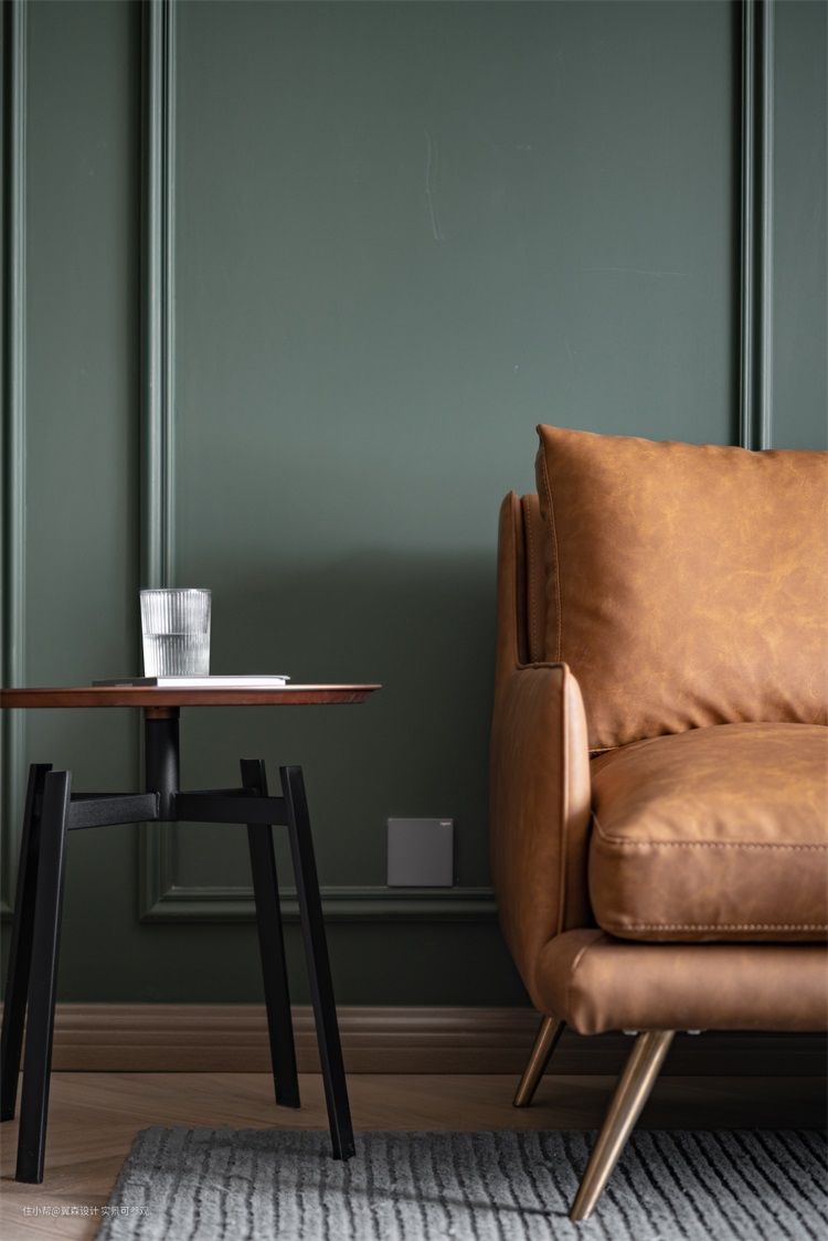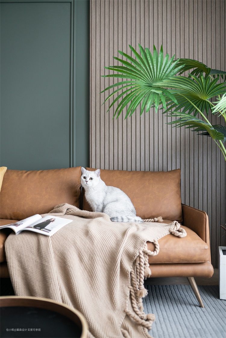 发背景便以“乳胶漆+木格栅”的方式呈现,通过材质的对比,更有层次感。焦糖色皮质沙发及木质边几的选择,又让屋内平添温馨复古氛围。