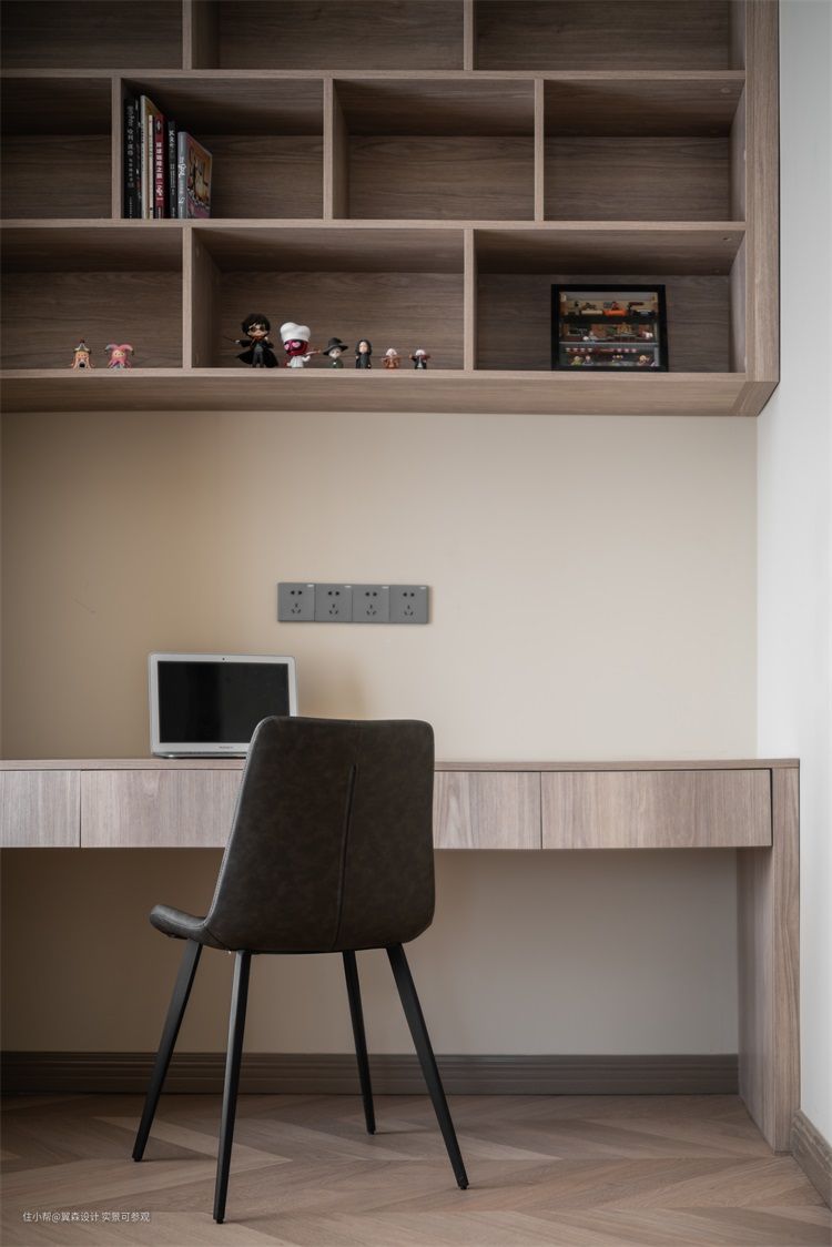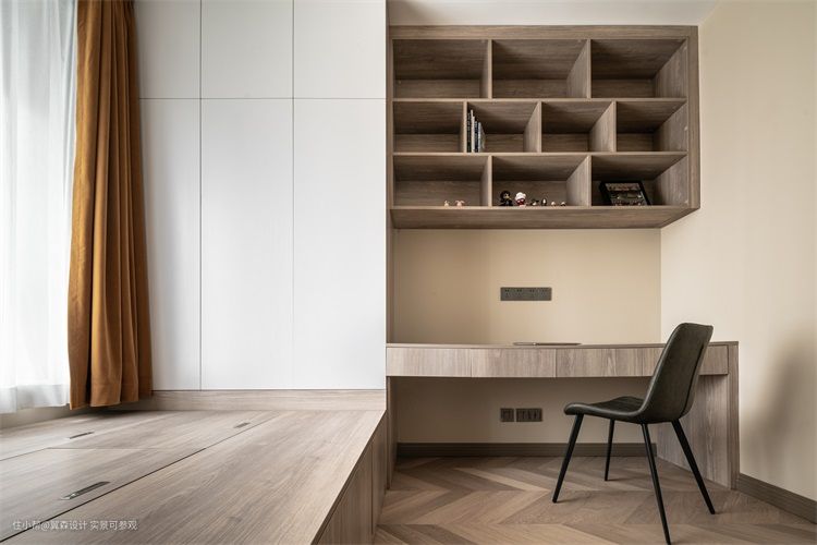 婚房规划时,考虑空间成长性,为未来做打算也是设计的重点。我们定制了一体化榻榻米房,现阶段方便屋主收纳、办公,也方便未来改造使用。
