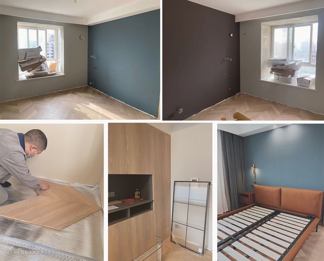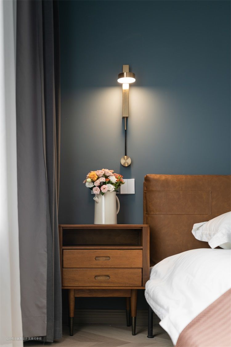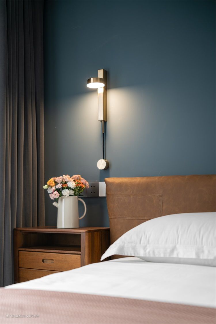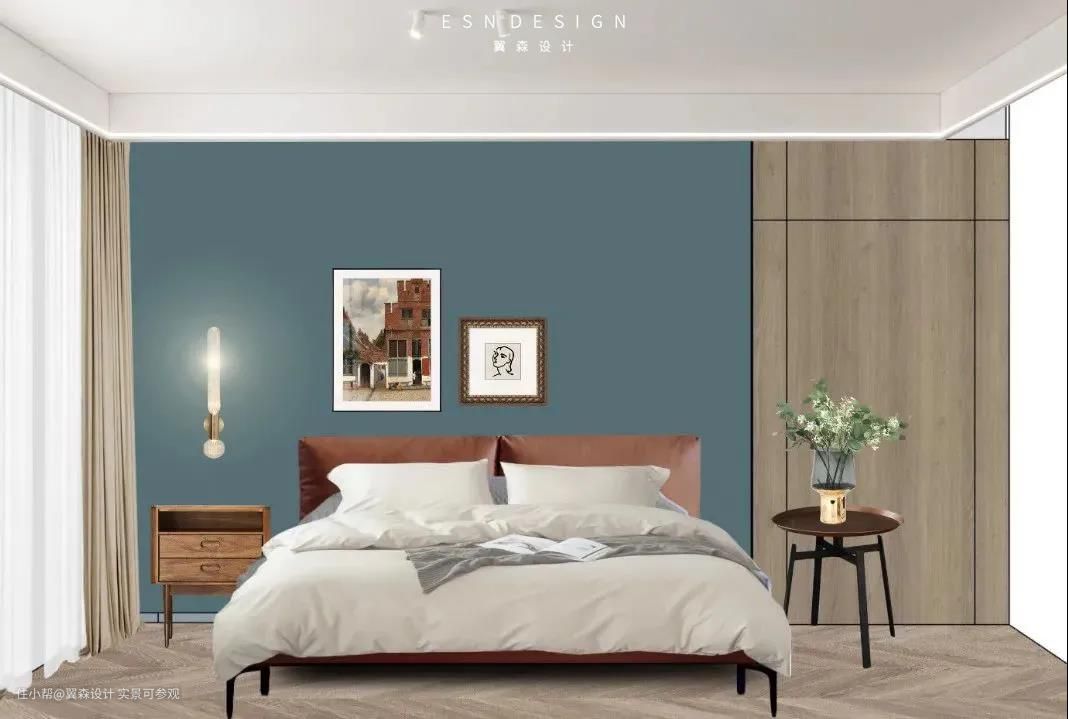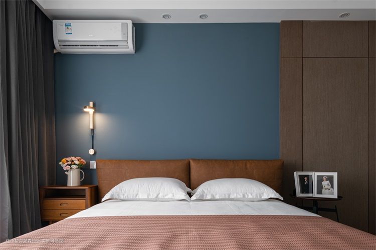 延续客厅调性,墙面我们选择“蓝色乳胶漆+木饰面”组合搭配,奠定整个空间沉稳的基调。软装则以温馨舒适为主,焦糖色的床靠背与沙发呼应,温馨且舒适。 与墙面衔接处,选择同色系隐形门,是设计师的细心之处也是设计的巧思。