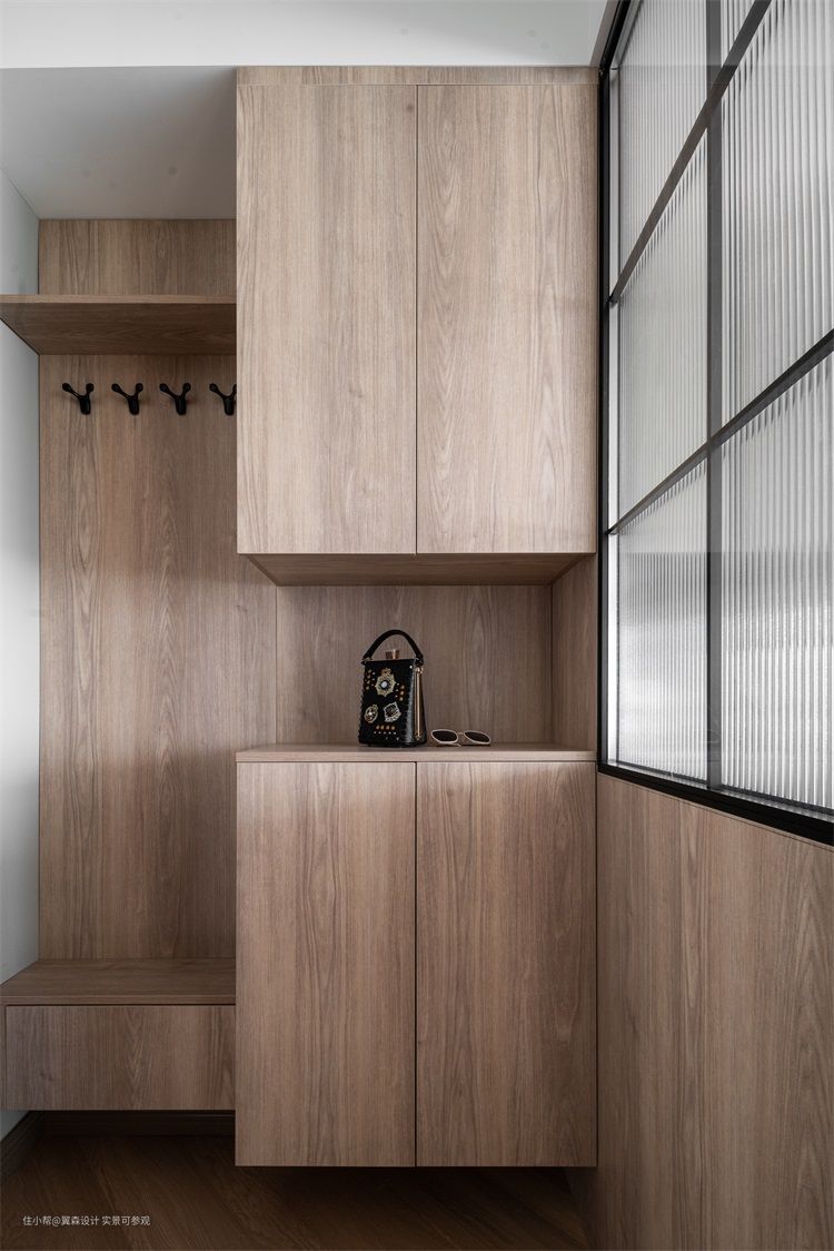 入户门厅主要强调实用性,进门左右定制鞋柜、置物架等,方便屋主平时收纳。 「长虹玻璃+木质半墙」的巧妙设计,既解决了原来空间“进门见厅”的无隐私性,又让回家多了一份仪式感。