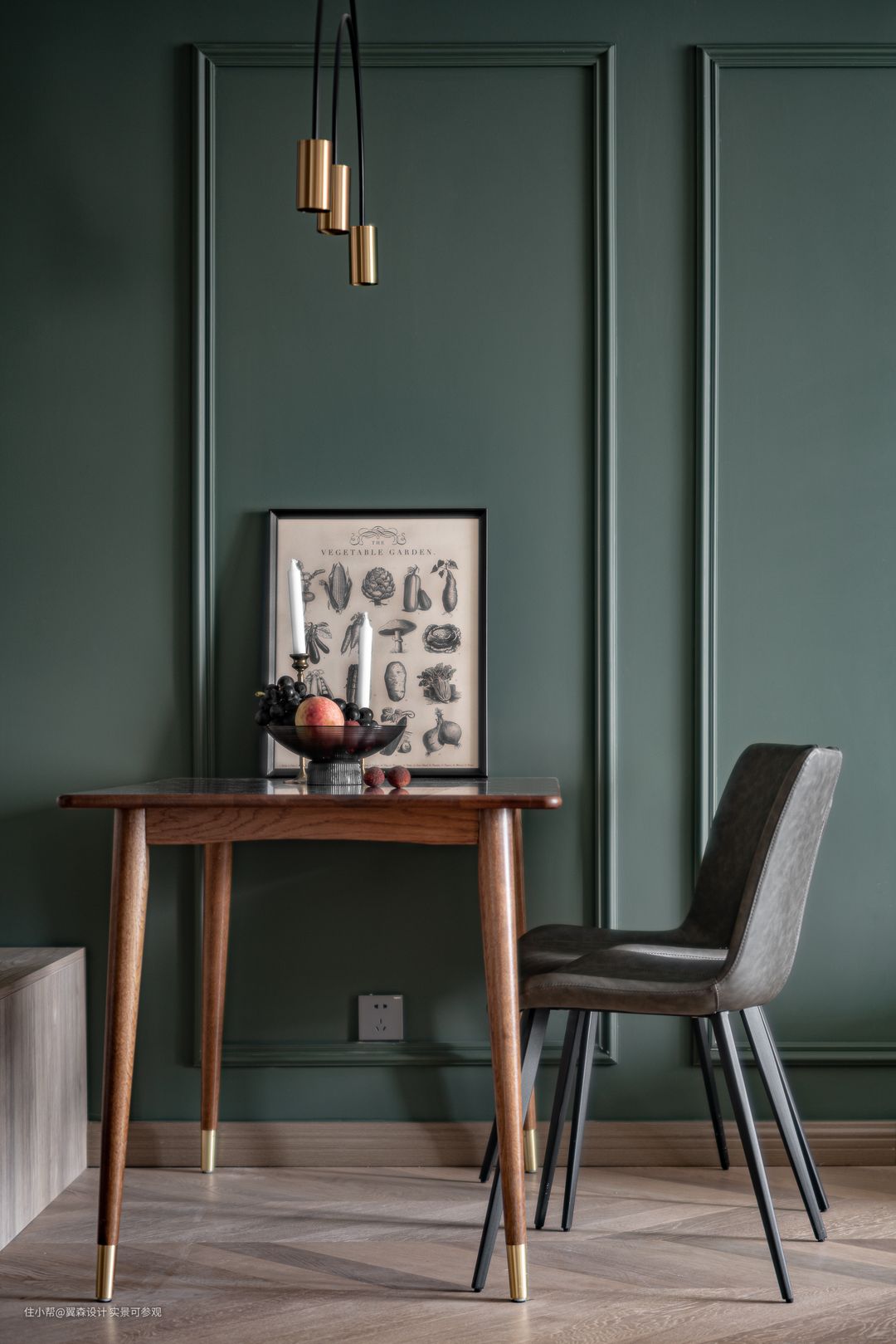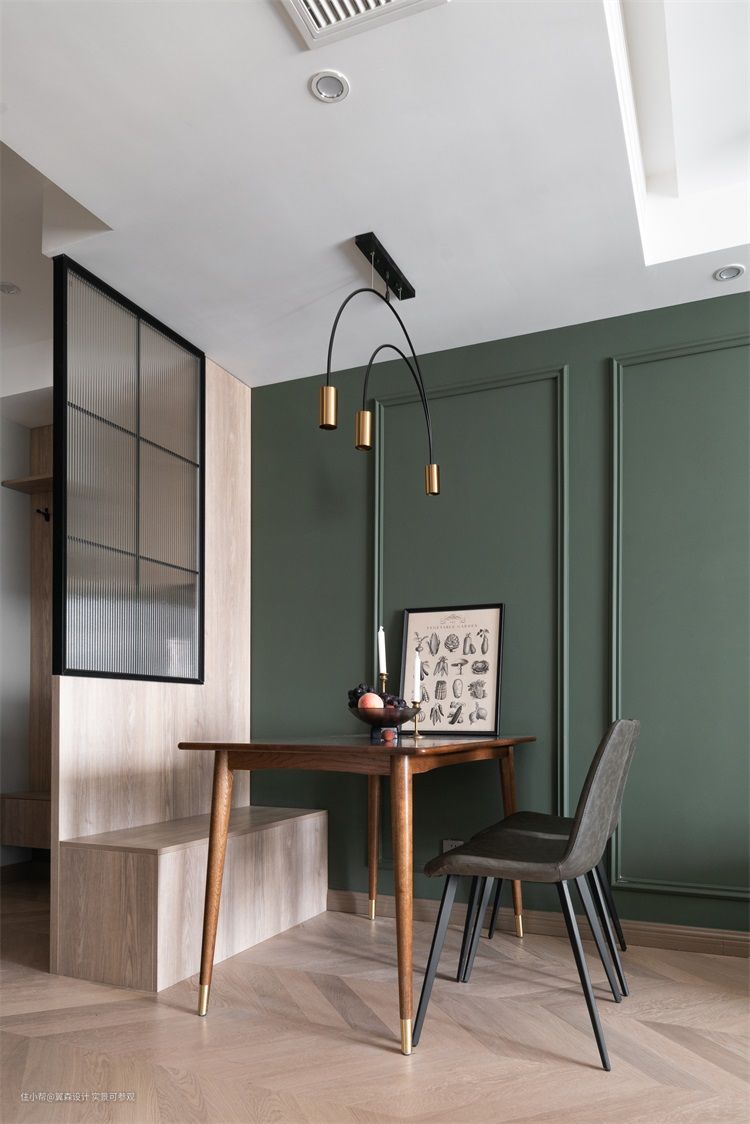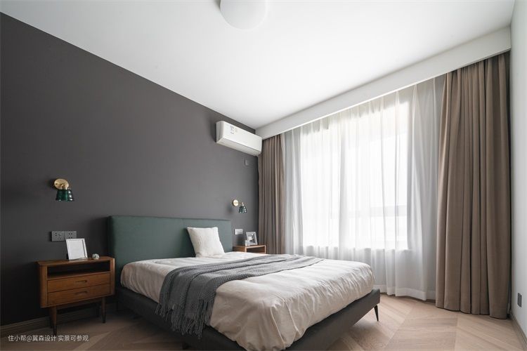 预留待客的次卧空间,整体设计更偏向沉稳大气。选择了相对深色的墙漆,搭配墨绿色床靠背,整体协调和谐。