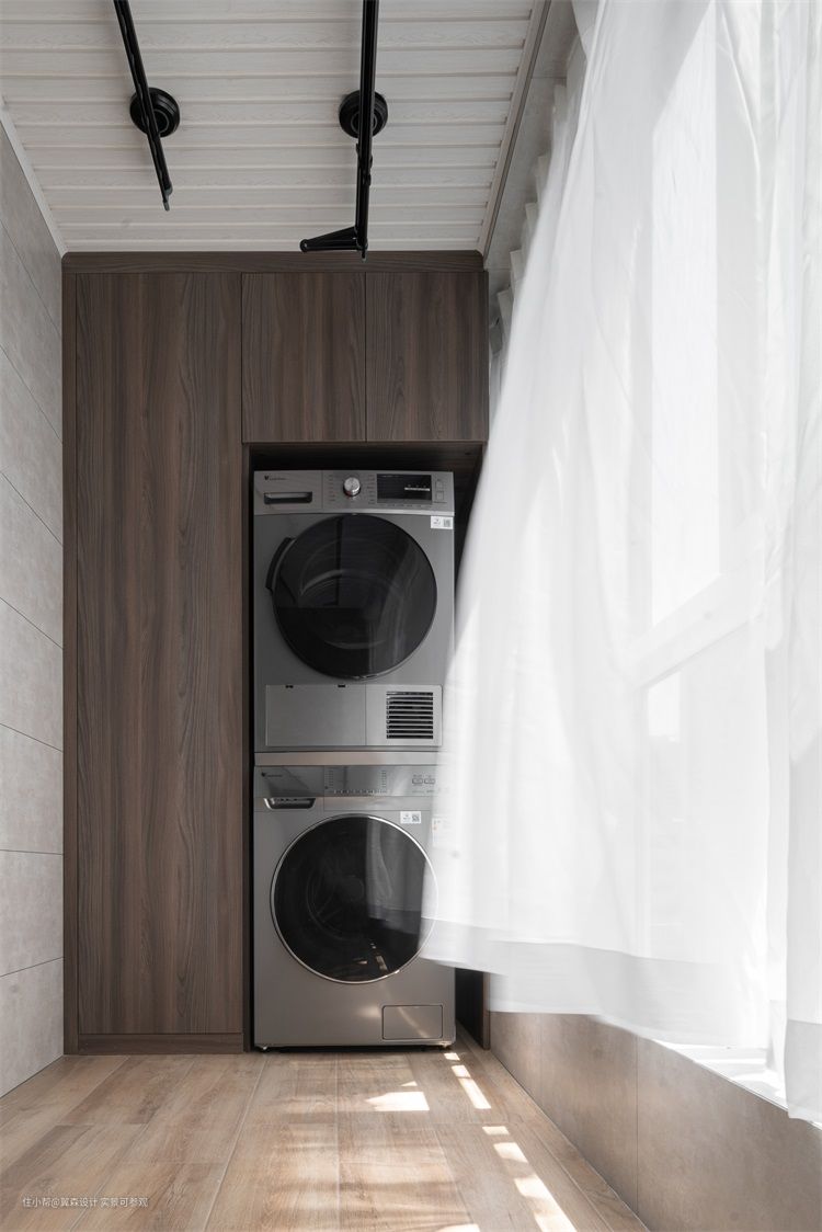 靠近主卧的5㎡阳台区域也没有浪费,定制柜体实现收纳的同时,利用原下水放置洗衣机、烘干机,满足洗衣、晾衣工作。