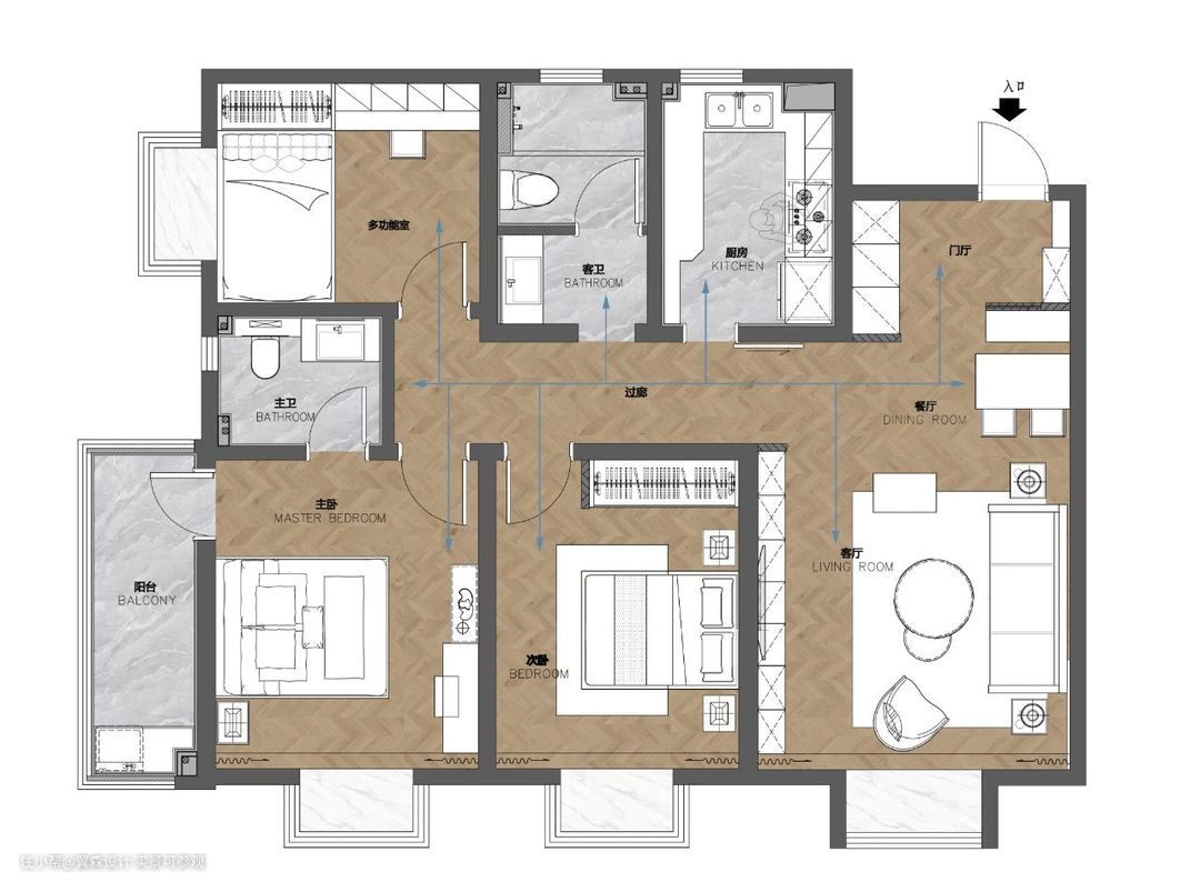 ❶入户格局重新规划,定制柜体满足收纳,门厅与餐厅分离;