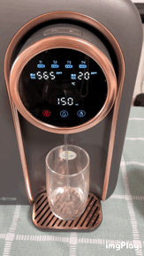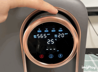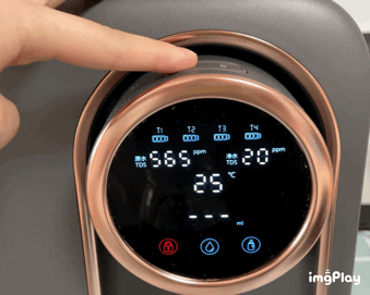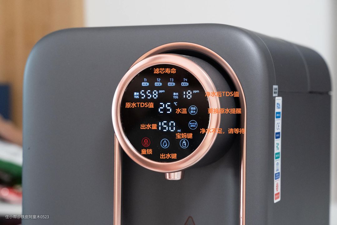 净水器正面有一圆形触摸显示屏,可显示滤芯寿命、实时进出水的TDS值、水温选择、出水量的选择、童锁按键等。