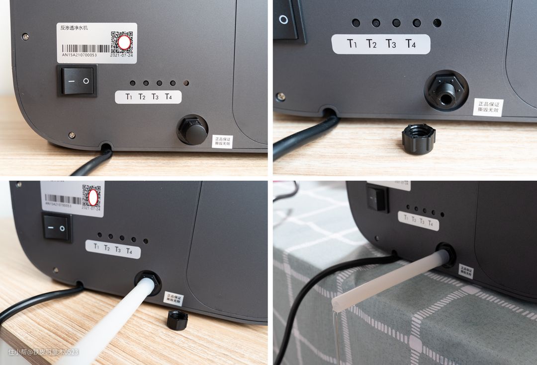 净水器的总电源设置在箱体后面左下角,同时旁边还设有排水口及四个滤芯复位键。