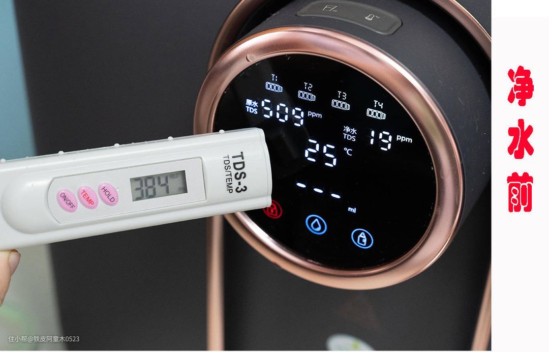 通过触屏上,我们可看到原水的TDS值和净水TDS值,但毕竟是机器本身显示的值,需要一个对比参数,于是我拿来家里的TDS测试笔进行对比分析。