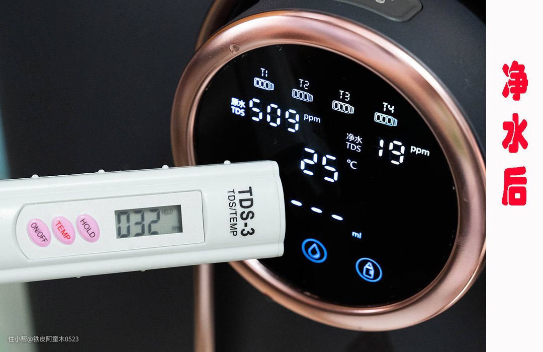 再来看看净水后的效果,净水器检测净水TDS值为19,而用检测笔检测的TDS值为32,也有小部分出入,但由于TDS在50之内均为可饮用的净水,所以我个人来讲还是可以接受的!