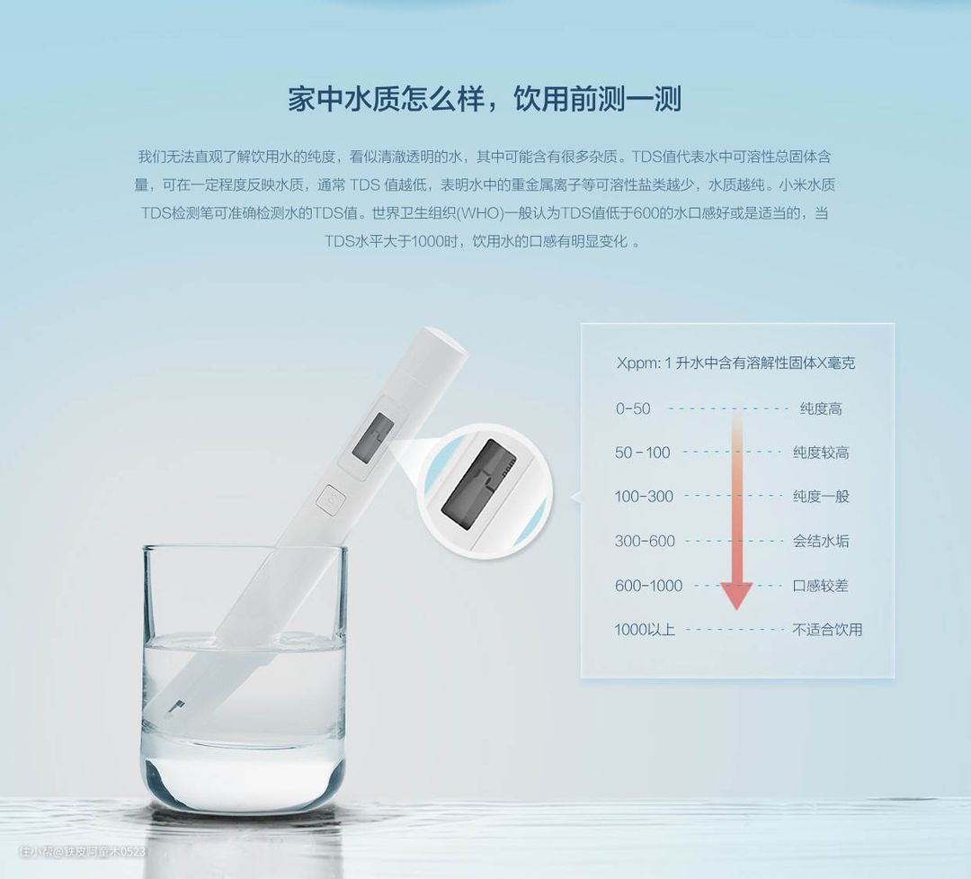 什么概念呢?一般情况下,我们通常用TDS值这种最为简单、直接的方法检测水质,虽然不能作为考量水质的唯一标准,但也能大致了解到水的纯度如何?