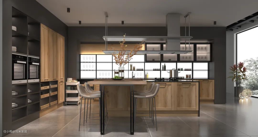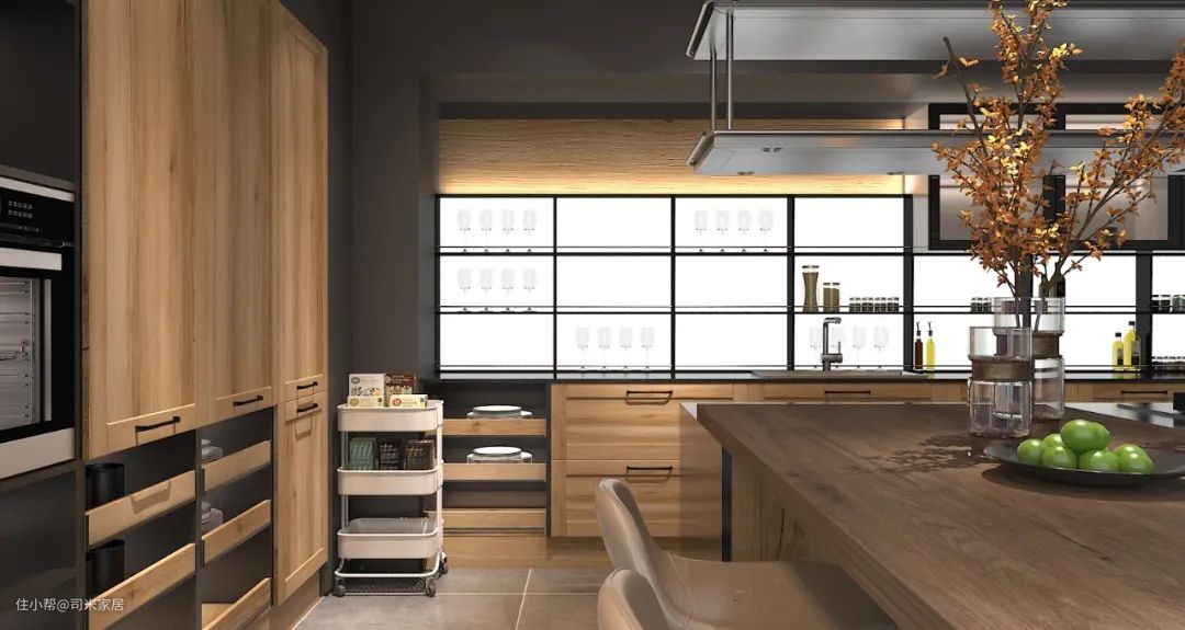 原木风空间常常给人宁静之感,就算是充满烟火气息的厨房空间,使用原木元素也可以令人完全放松下来,从生活的烦恼中抽离开来,享受美好的烹饪时光。