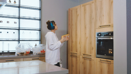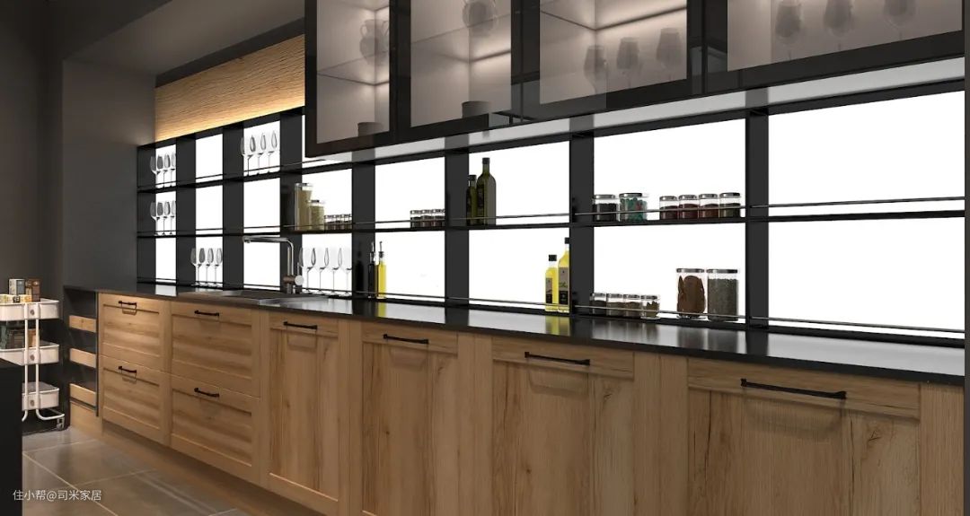 下拉拉篮人性化地榨干吊柜空间,调味拉篮让不规则的瓶瓶罐罐有了归属地,强大的收纳系统营造了简洁有力的空间秩序。