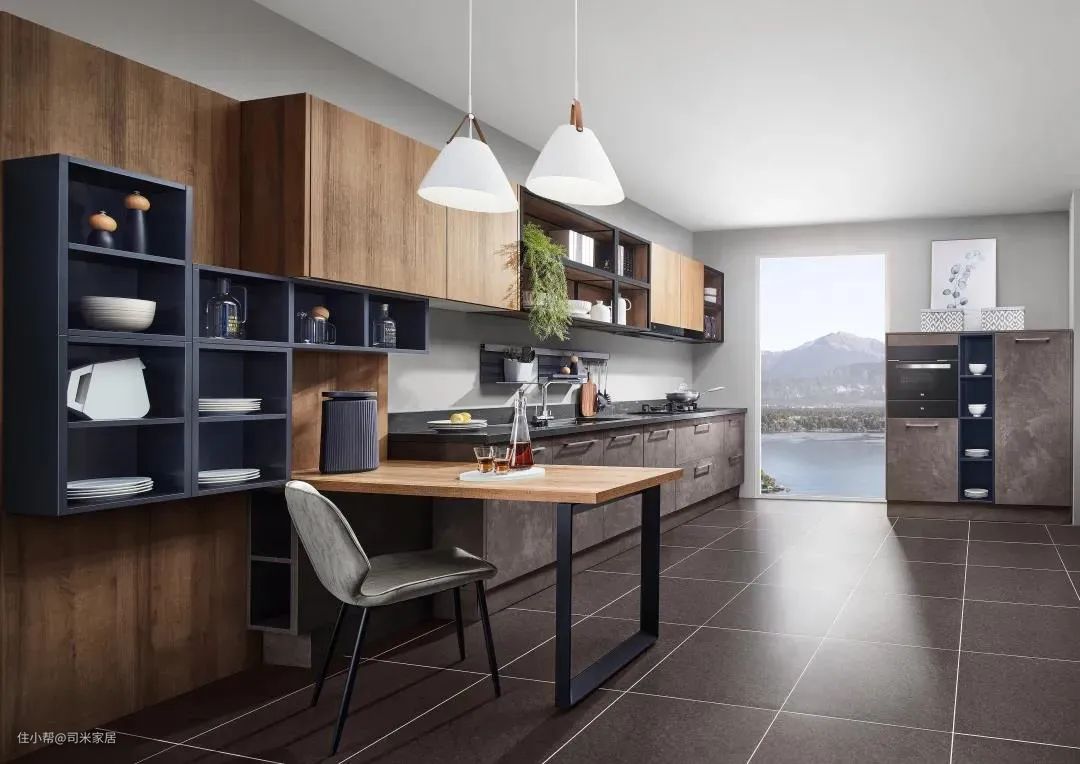 简约的开放式厨房与原木橱柜让自然气息扑面而来。