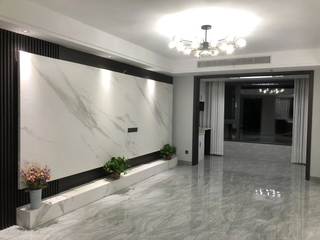 与客厅阳台相连,增加了很多室内面积,使空间宽敞,从而更好地利用阳台空间。设计了流行的悬挂式大理石电视墙,造型简洁大气,视觉感强。背面是格栅设计,更有质感,细节高度。我没有选择传统的电视柜,而是选择了地台的搭配,比较流行,大家都喜欢。这就是不加家具的效果,我很喜欢。