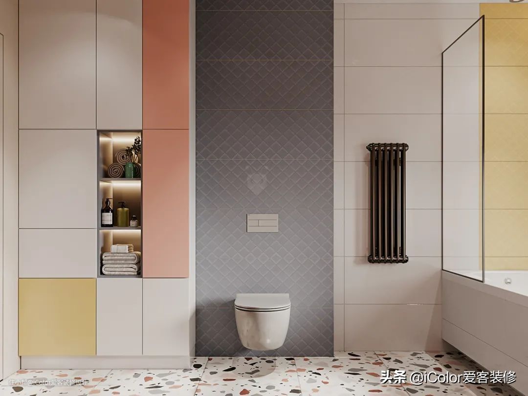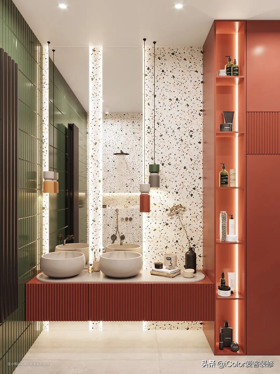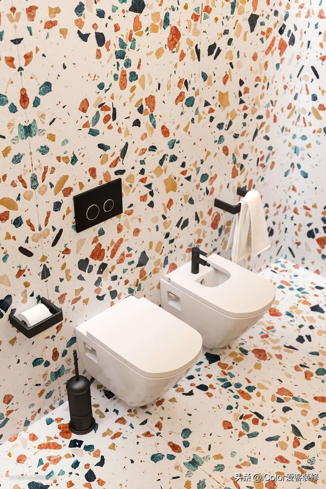 当可盐可甜的水磨石与醒目的色系形成组合时,活跃饱满的碎片化视觉填充了原有墙面的单调,充分调动起愉悦的空间情绪,为卫生间带来更为疗愈、更为明快的夏日氛围,深受喜好新鲜、个性化年轻一族的偏爱。
