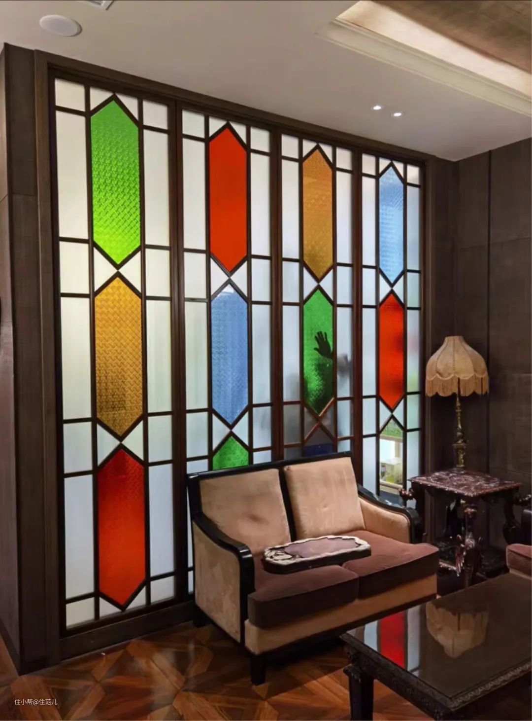 如果觉得普通玻璃太单调,可以根据软装颜色,搭配少量的还印花玻璃或艺术玻璃。
