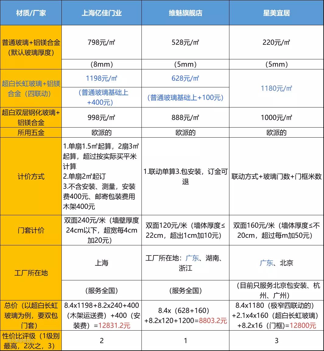 我以(高x宽x门洞厚度)2.1x4X0.17m尺寸,做16mm的四联动极简推拉门为目的,分别向三家询价,下面是整理后的报价单。
