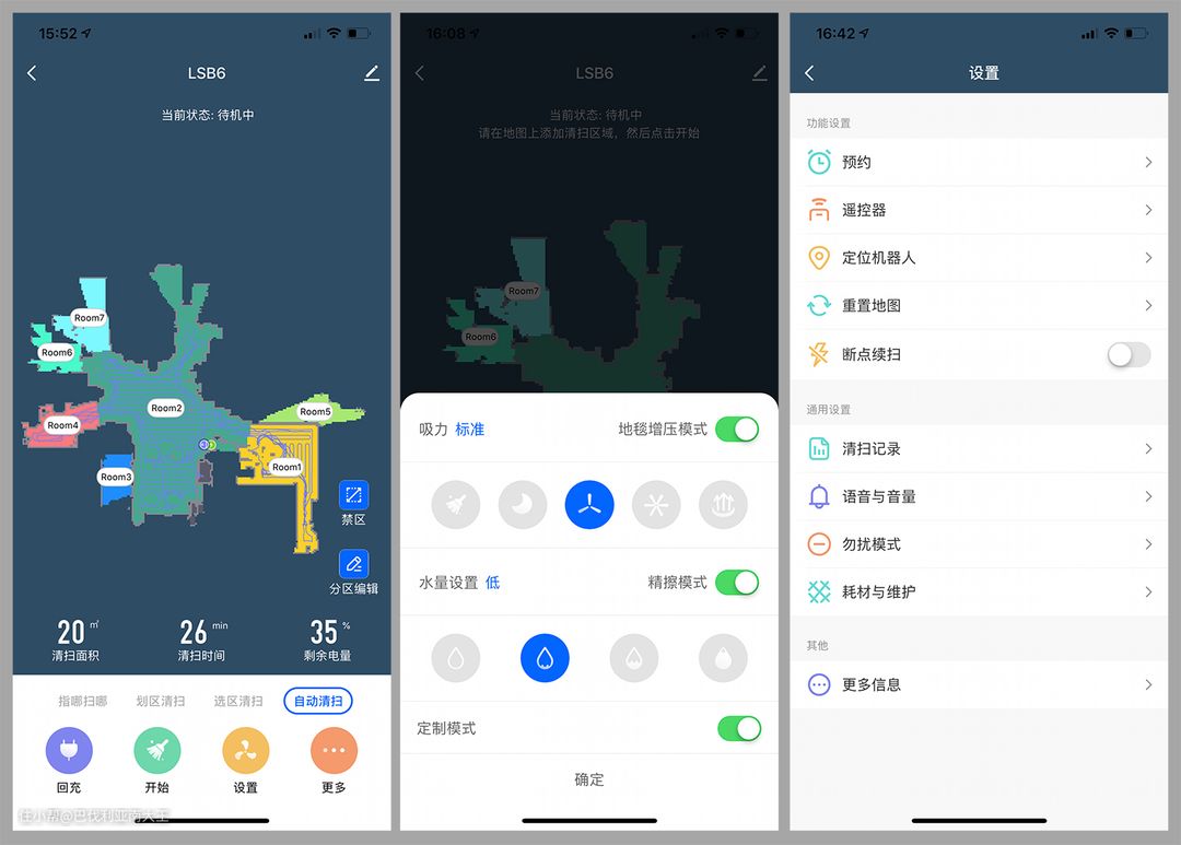 配备的5200mAh电池,可以说是超长续航了,一次清扫250多平的大户型不在话下。实测在满电状态下运行,我家100多平的面积清扫+各种测试,中途完全不需要充电。