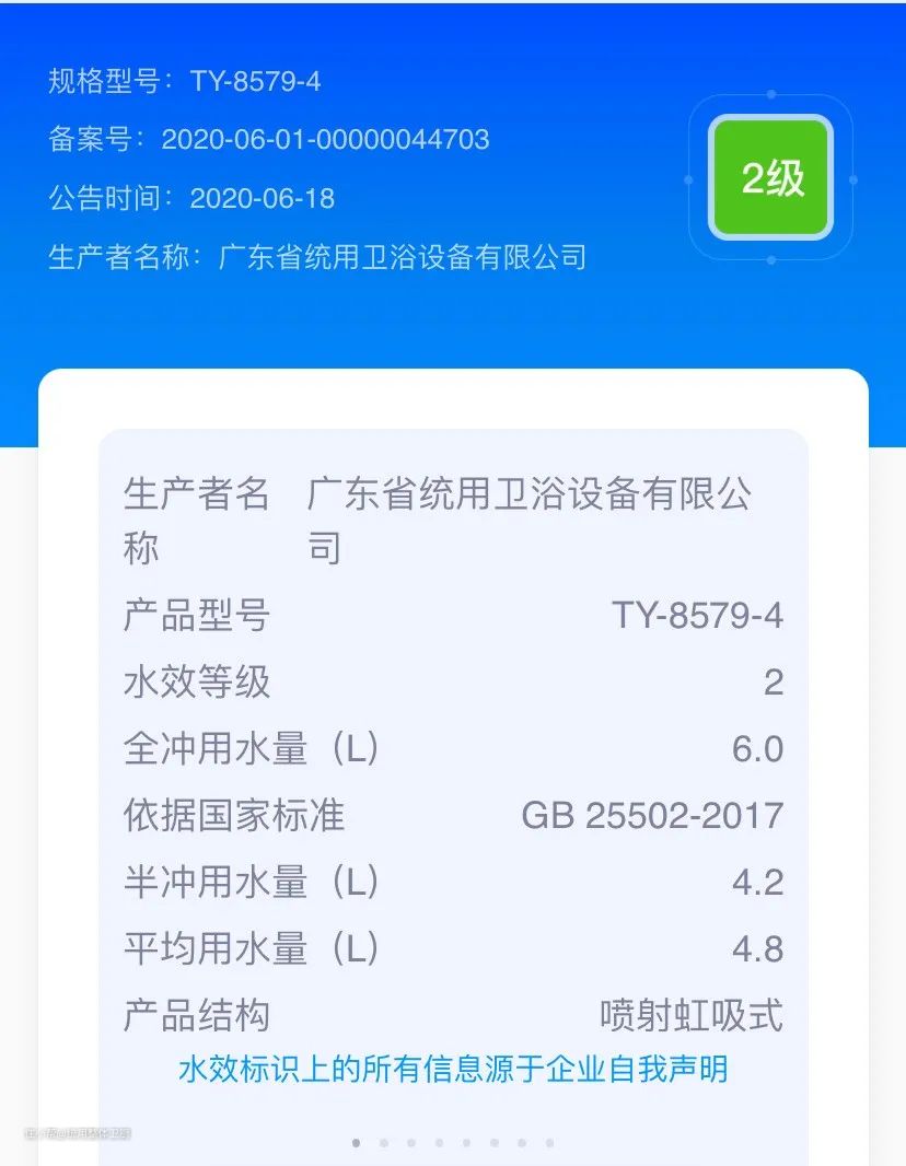 水效等级自上而下分为3级,通过标识上的水滴个数和颜色,即可区分产品的水效等级,1级耗水最低,3级耗水最高。通过手机扫描标识上的二维码,就可辨别产品真假和水效情况,进而做出最佳选择。现市场上某些杂牌没通过水效认证的,其冲水可能超过10升,一年下来费水量可想而知。