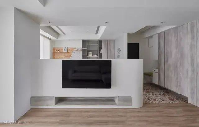 半墙设计的材料不局限于水泥石砖,也可以是木质材料,空间允许的情况下干嘛用柜体替代墙体,增加收纳空间。