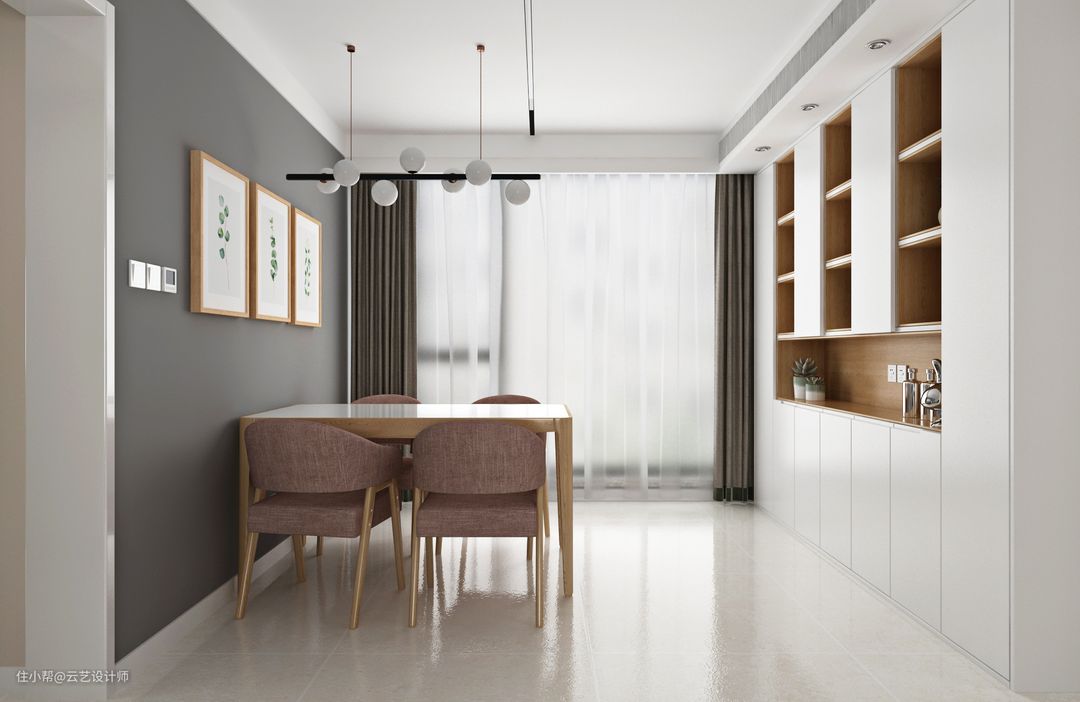 ▲▲餐桌的造型和颜色也是为了和整个空间相融合而精心搭配的,餐边柜的形式又和客厅的墙面柜相呼应,墙上的木质挂画拉平了左右空间的户型关系。