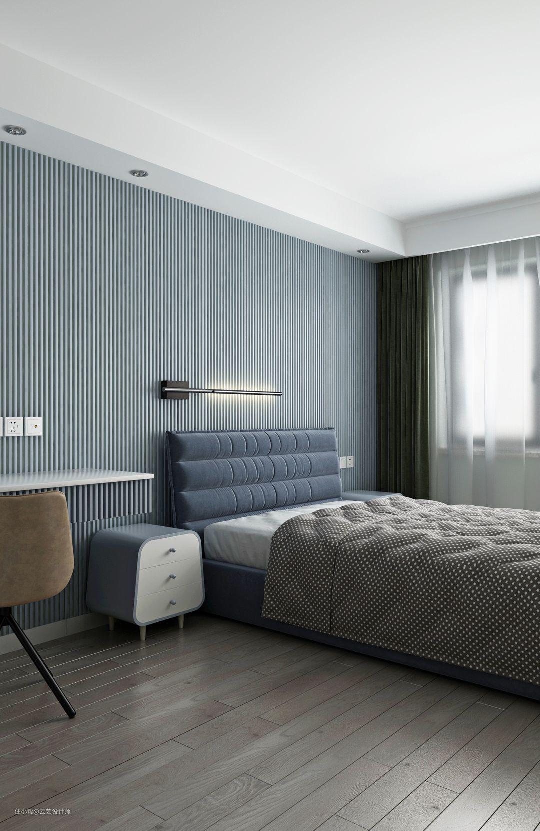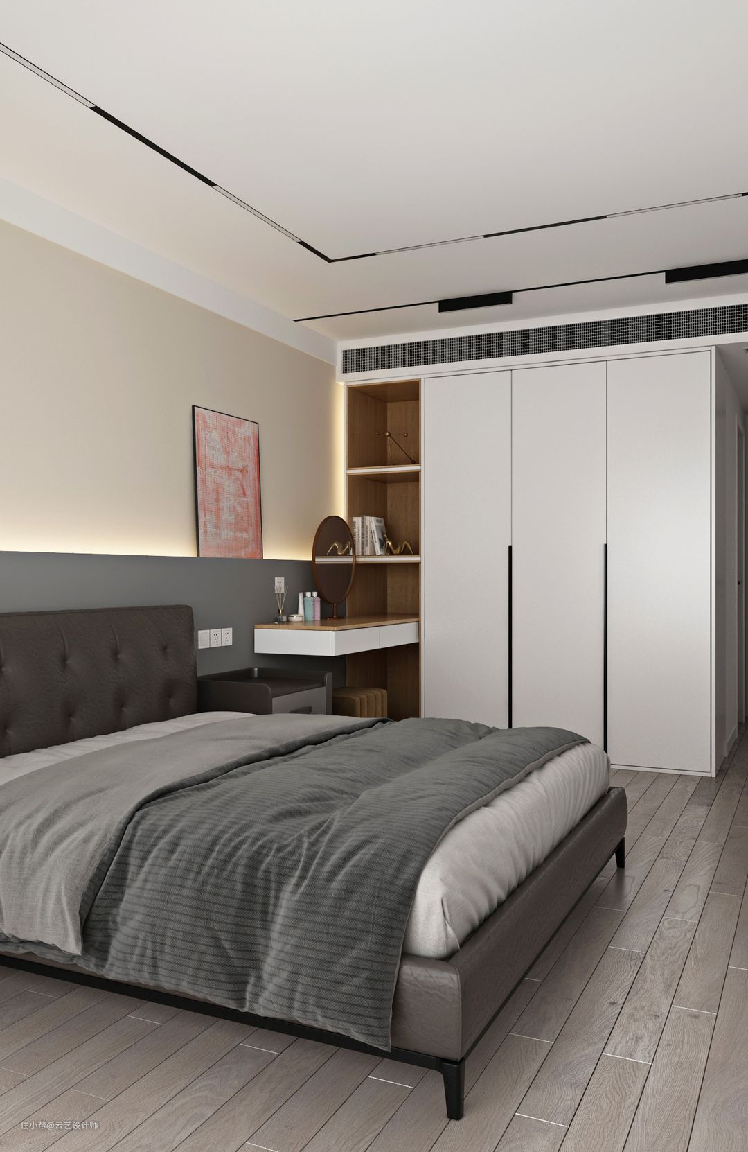 ▲▲主卧的背景特意设计成外延伸形式的一字护墙板,这样就不用在墙上留床头灯的位置,保证了墙面的完整性,而且这种一字板内部发散出来的光是很柔和的,上面的平台也是可以放很多随手的物件,美观又适用,背景墙的乳黄色让整个素雅的房间有温度感。