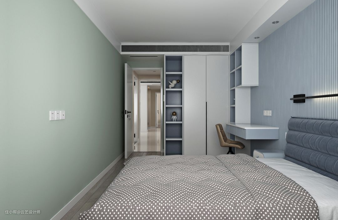 ▲▲浅蓝色+浅绿色构成了儿童房的空间色,多样化的组合书桌、柜让空间生动活泼。