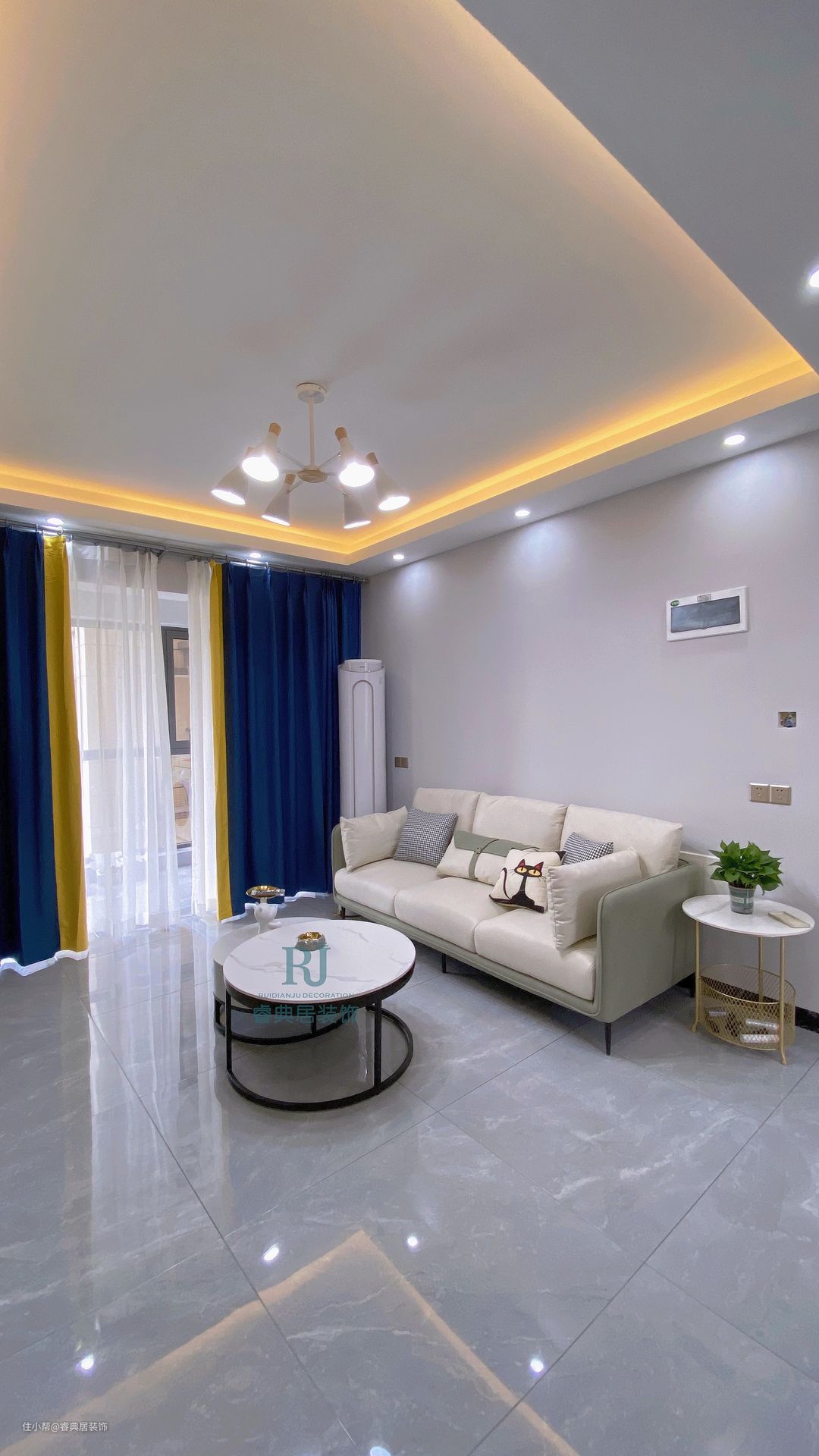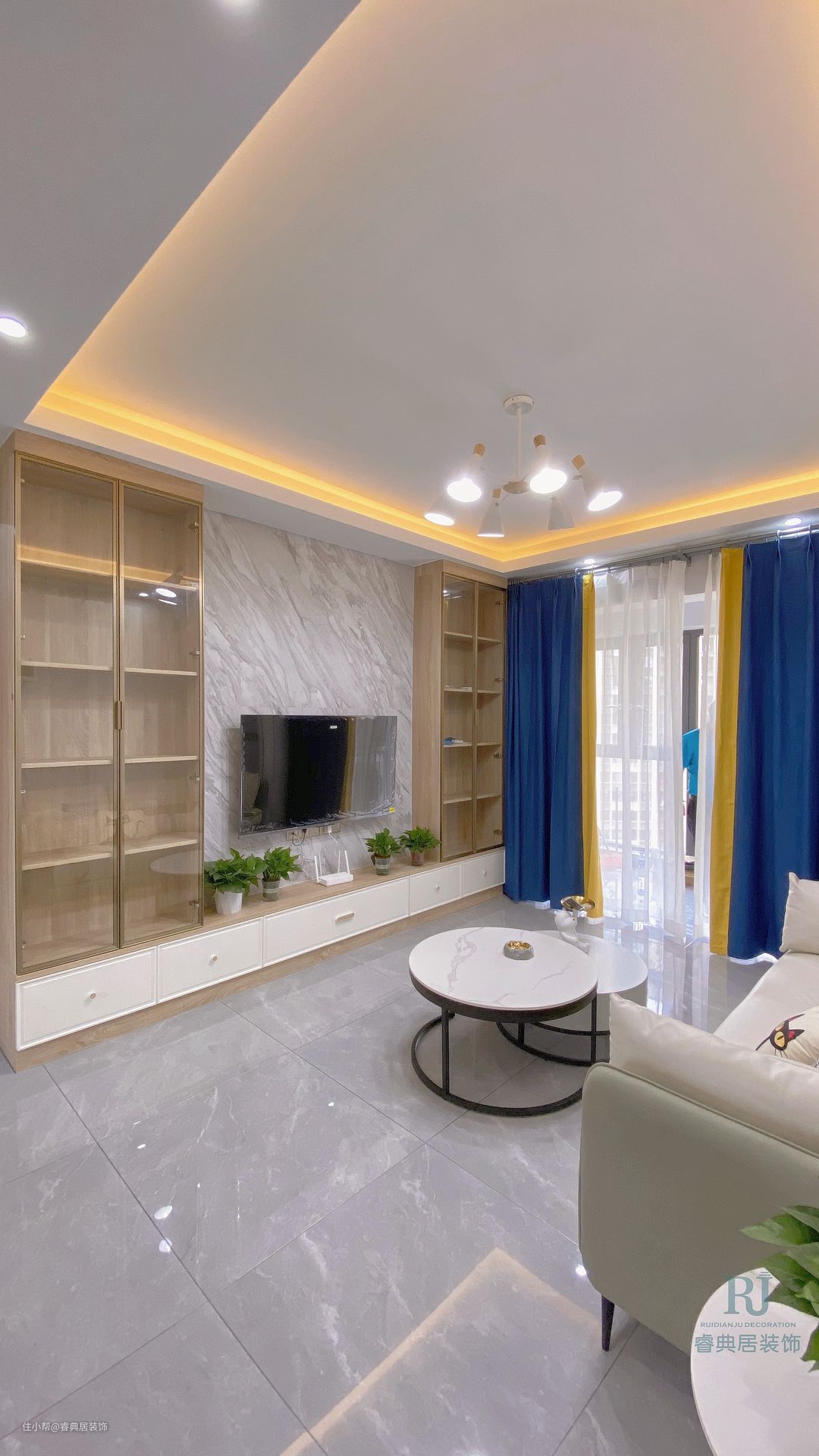 高级灰+原木色以简约的设计手法来诠释,冷色系的瓷砖,辅以暖黄色的灯带和原木色的柜体与珍珠白的柜门以增加室内温度感。即使主色调较为冷冽,利用一点点暖色呈现整体风格,现代简约和温暖和煦,不再是两种截然不同的方向。为了让空间色调不单一,有一种跳脱的美感,设计师安置了亮黄色和高级灰对称的椅子、亮黄色与藏蓝色的窗帘,不同色彩的家具,丰富空间的视觉效果。