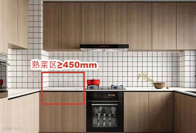 炒好菜后需要有一个空间用来放盘子盛菜,也需要一个区域临时放锅,所以灶台区域不能设计在边缘,两边要留足空间,用起来才更方便,一般盛菜区域≥450mm才够用。