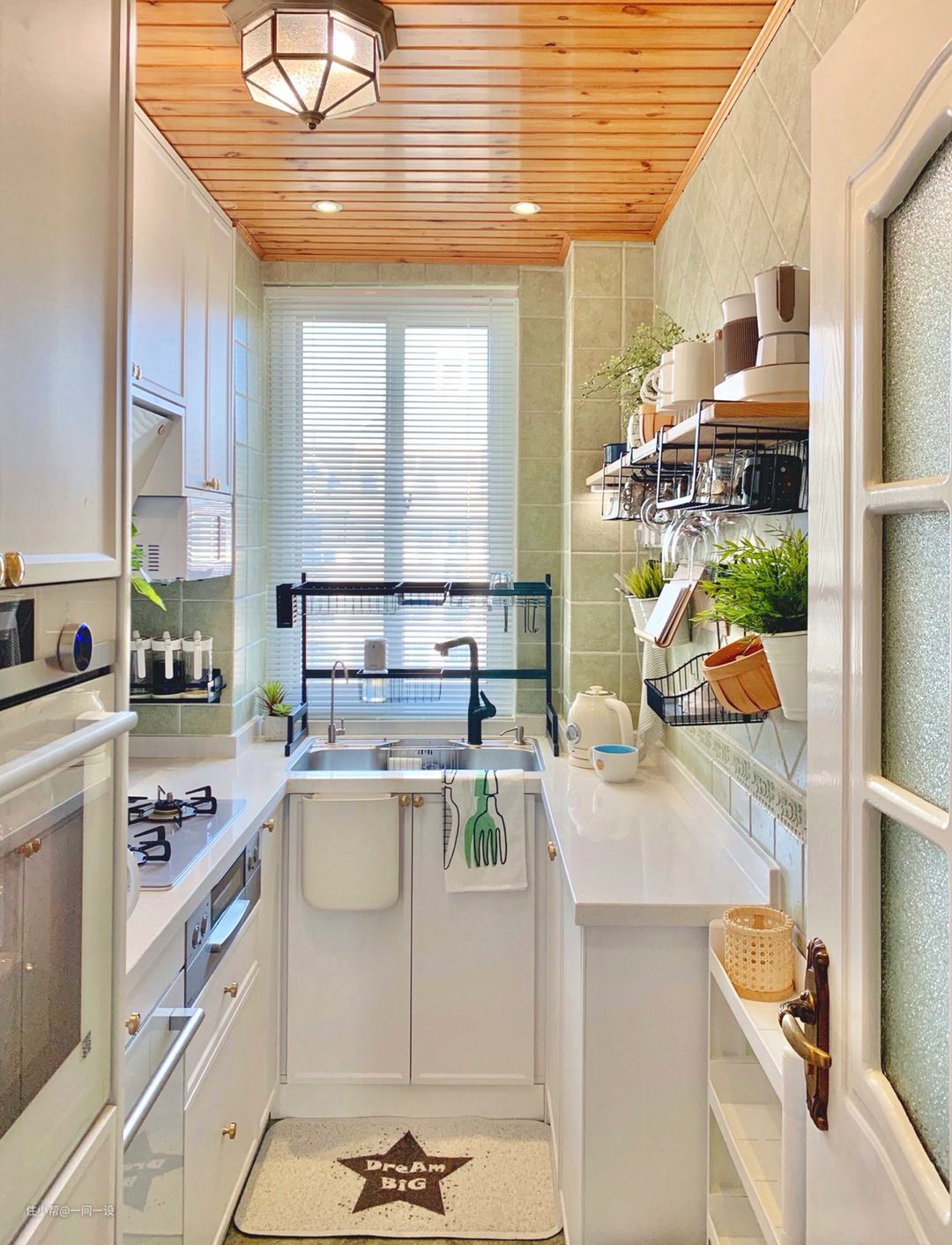 如果L型厨房、一字型厨房台面台面空间不足,考虑能否在橱柜对面设计一组窄柜,用于放置小家电,一定不要忘记留插座哦。