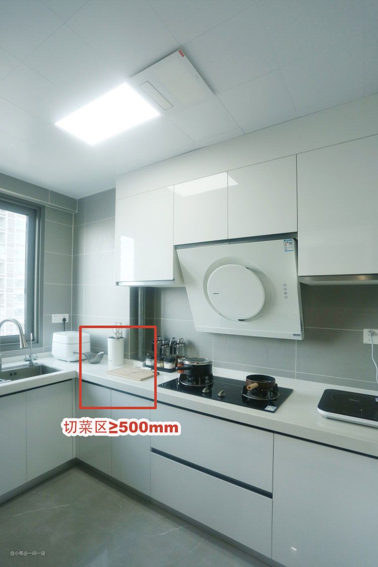 切菜区空间越大,做饭时越能施展的开,但空间不充足时,也要保证能放下砧板,尺寸≥500mm用起来才舒适。