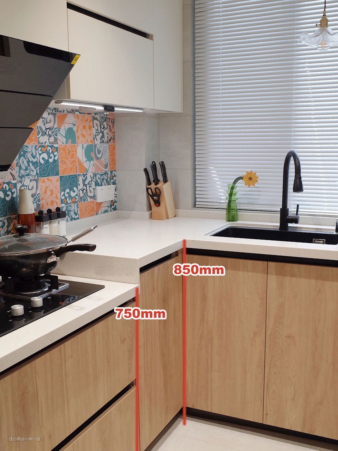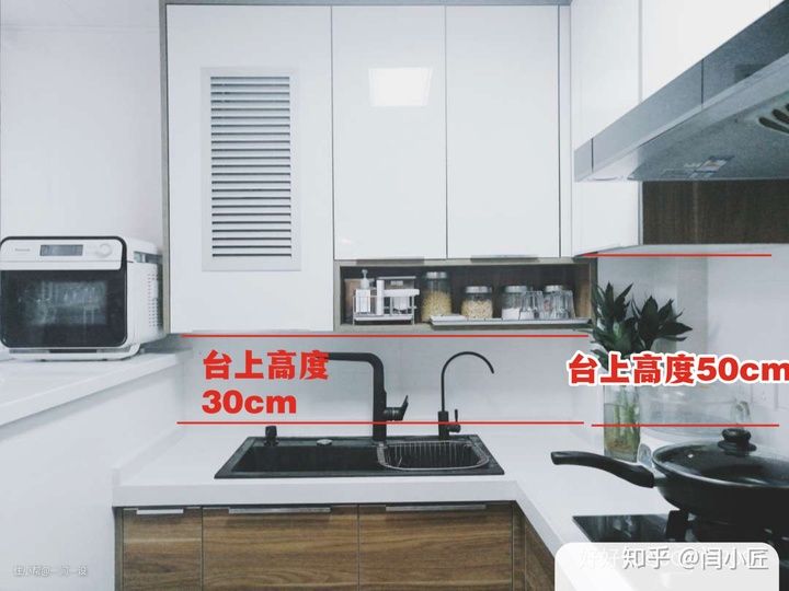 由于洗菜盆是凹下去的,而灶台上方需要放锅,如果统一高度,可能会要弯着腰洗菜,抬着胳膊炒菜,所以通常建议洗菜区的台面高一些,而炒菜区的台面矮一些,做成高低台面,比较人性化的高低台面,高度相差100mm左右为佳。