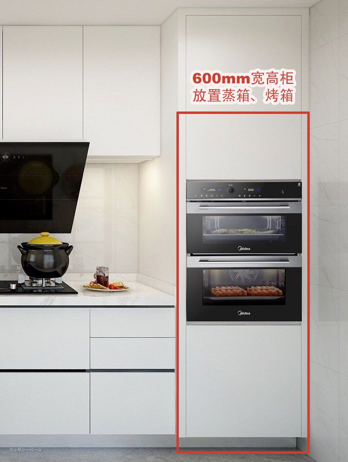 橱柜其实没必要全部做成上下吊柜,可以利用60公分宽度设计一个高柜,用来收纳蒸箱、烤箱,不仅实用,还很美观。