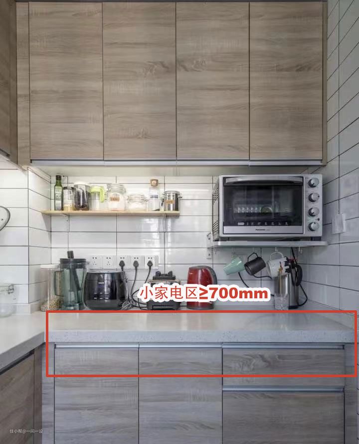 如果空间富裕,要留一块区域放置小家电区,用来放置厨房常用电器,如微波炉、热水壶、电饭煲、电饭锅、蒸蛋器等。小家电区域要≥700mm,要是空间有限,此区域可以与备菜区、熟菜区重合。