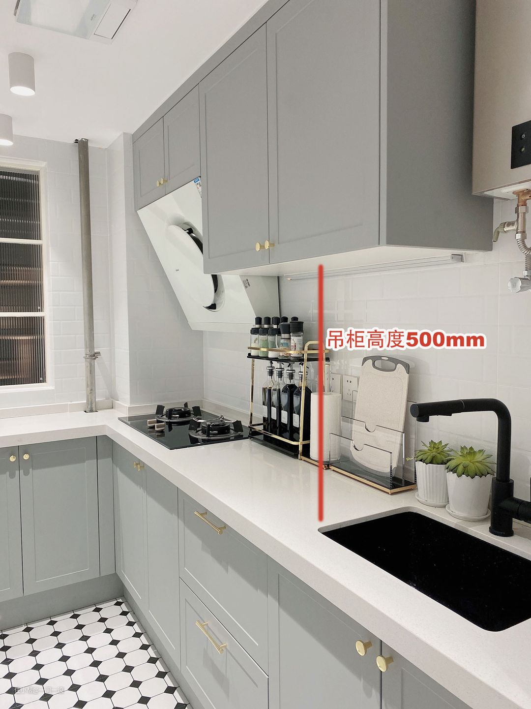 很多厨房在炒菜时,一不小心就脑袋就碰到了吊柜,那酸痛......,那是吊柜高度设计的不合理,一般吊柜高度我们建议离台面高500mm,不撞头,拿取东西也方便。