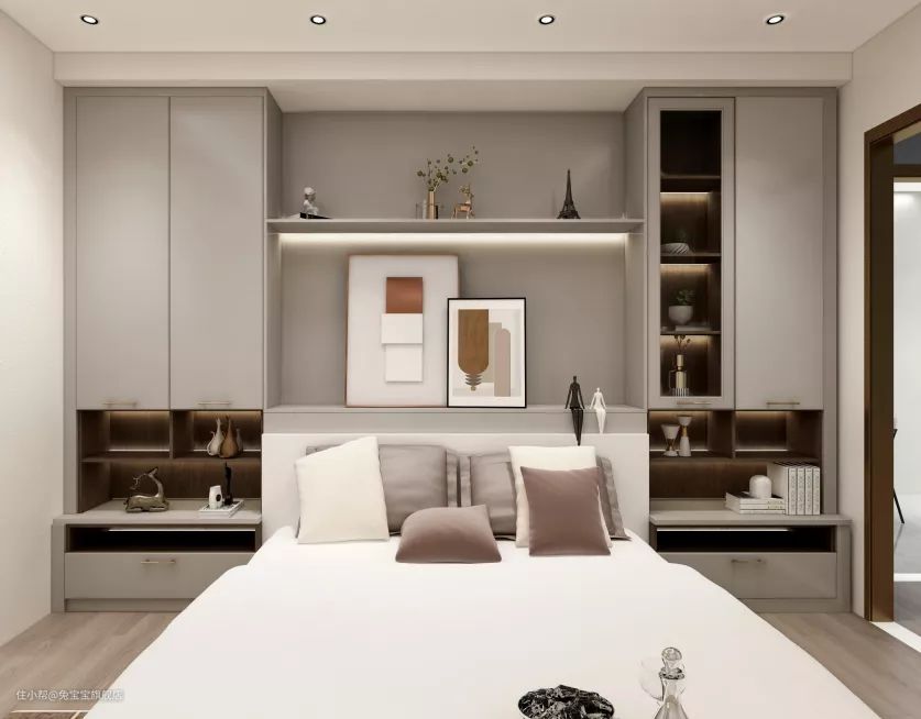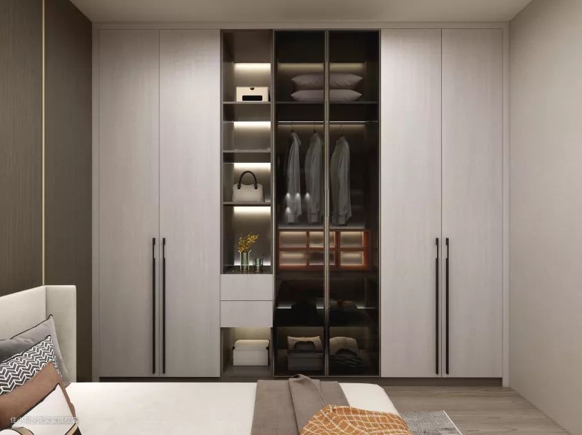 卧室空间中衣柜也是必不可少的,随着技术的成熟,设计能力的提升定制衣柜也变得越来越多样化和时尚化,其中这种一门到顶的柜门在轻奢装修风格中特别风靡,搭配长拉手,再结合茶玻、跳色、灯光,可以营造出舒适度和品味双佳的卧室氛围。