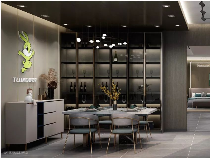 电视柜、酒柜的柜门可以选用高光白,更加符合轻奢风的气质,开放区可以使用跳色点缀,如图中的TBB18004-兔宝宝橙,柜体板材使用TBB19805-雨丝灰橡,两者都为兔宝宝TM系列(家具板),它是在生态板的基础上进行了强化升级,所以使用TM系列板材可以更好的保障环保且时尚的居住环境。