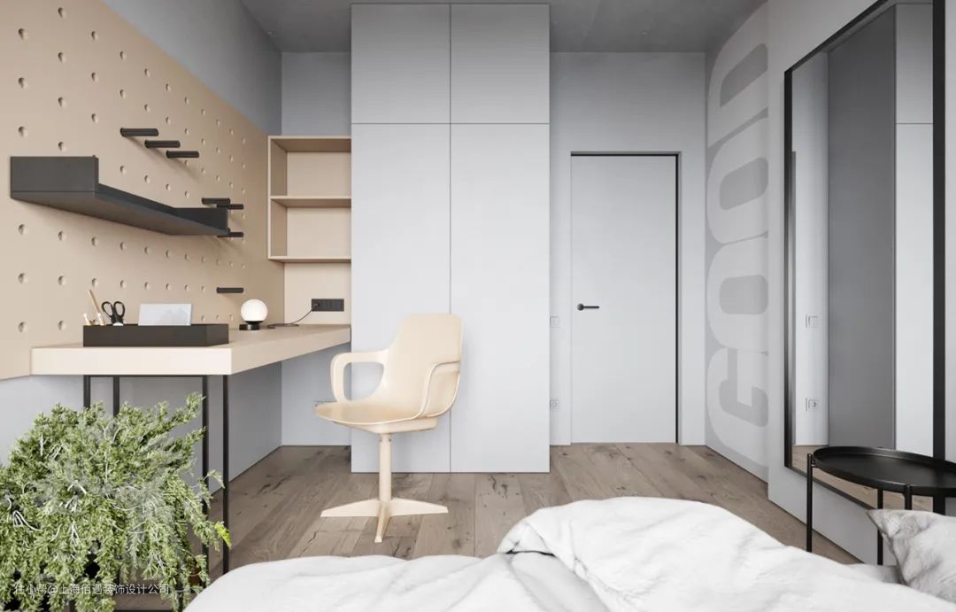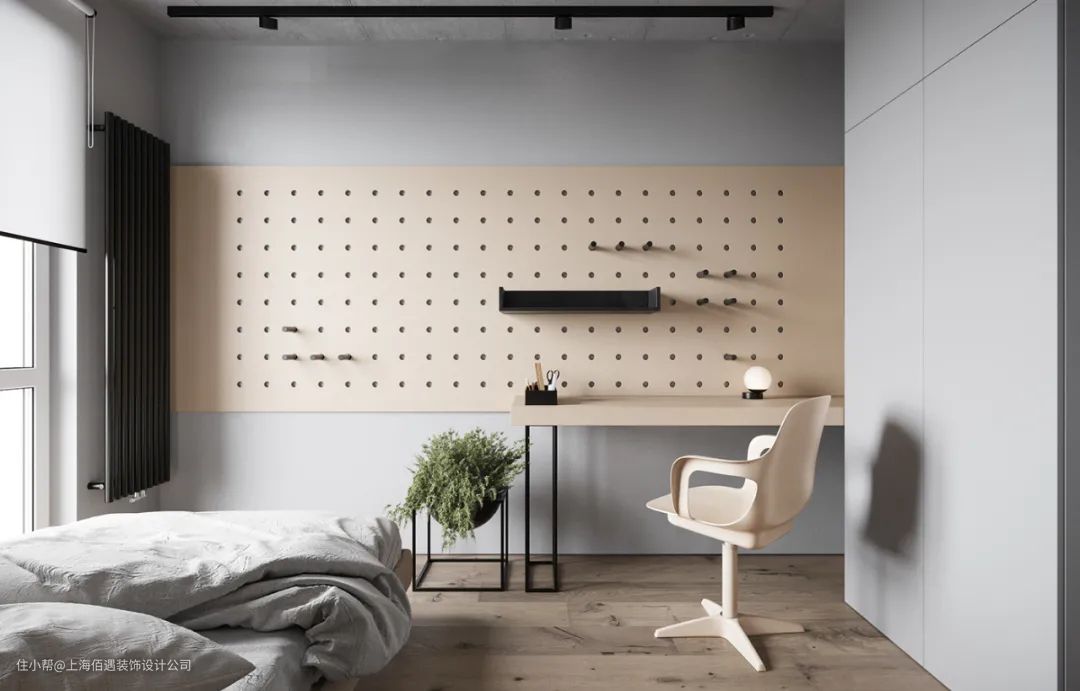 ▲家中共有两间儿童房,一间以宁静淡雅的灰色为主题,设计师将空间进行了有效的划分,贴着墙面定制儿童床,上方以洞洞板的形式作为灵活的储物空间,一旁的顶天立地柜用于收纳衣物等大件物品,并在窗边定制了学习区。