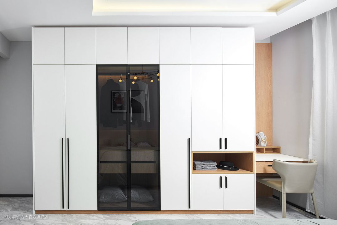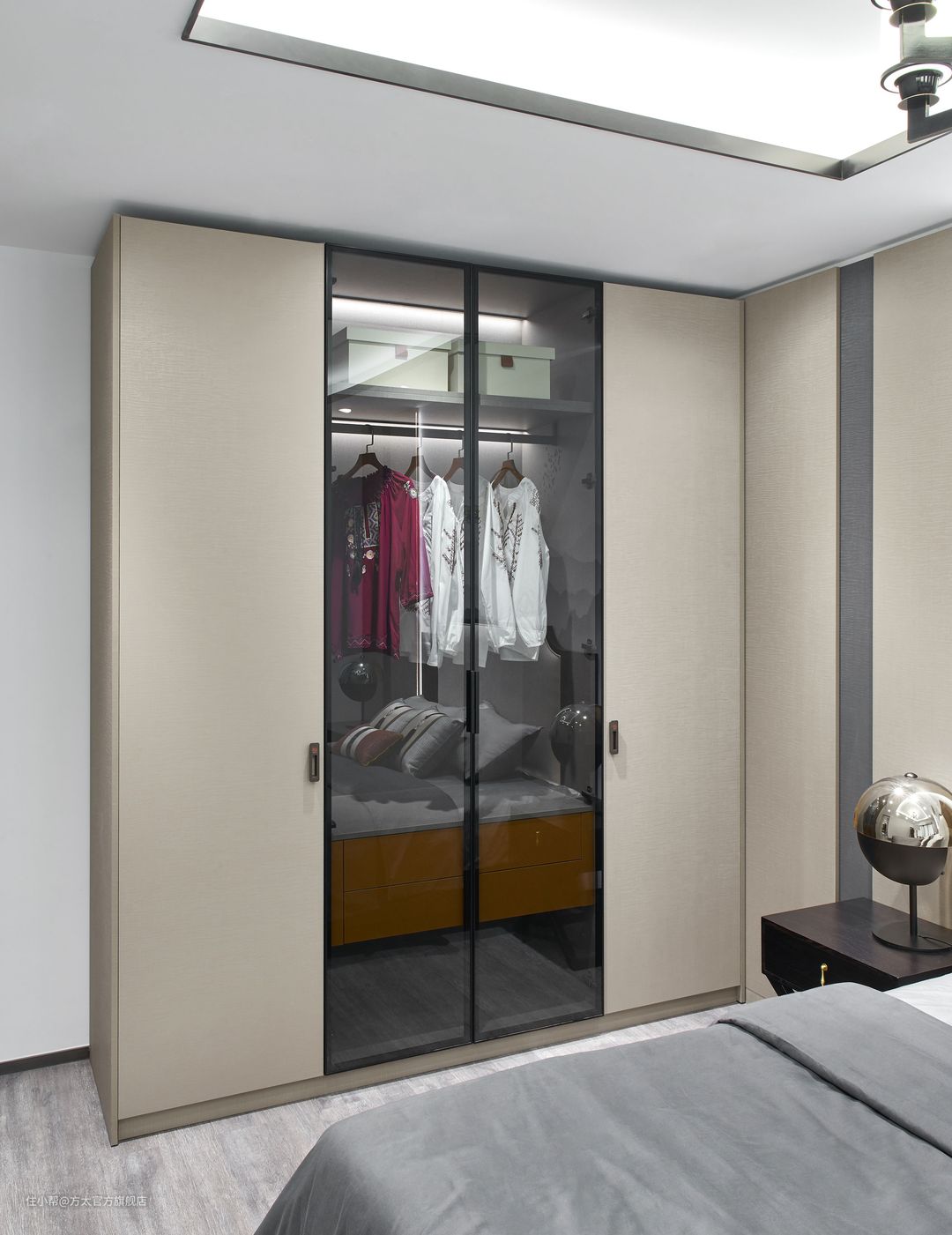 衣柜是卧室中最大的收纳空间,可以采用顶天立地式大衣柜将一整面墙的空间全部用上。如果感觉空间有些沉闷和拥挤,建议选用透明玻璃衣柜门增加通透感,即藏得住优雅与得体,也看得见格调与品位。