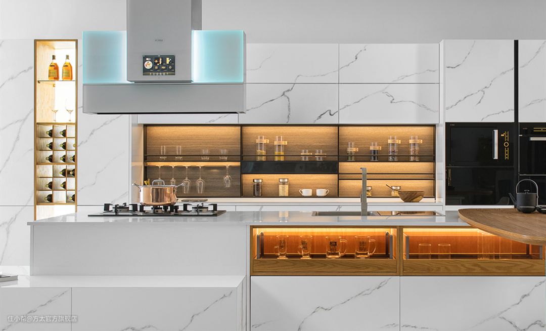 值得注意的是,对于置物区的补光,有些厨房的厨柜深度较深,虽然容量较大,但若光线不足,会给寻找物品造成一定的难度。这时可以考虑在厨柜内部增加灯带照明,这样不仅会给打开厨柜的你带来惊喜,也让拿放物品更加便利。