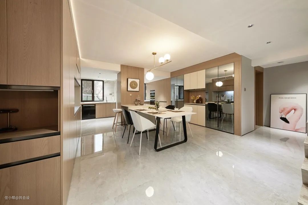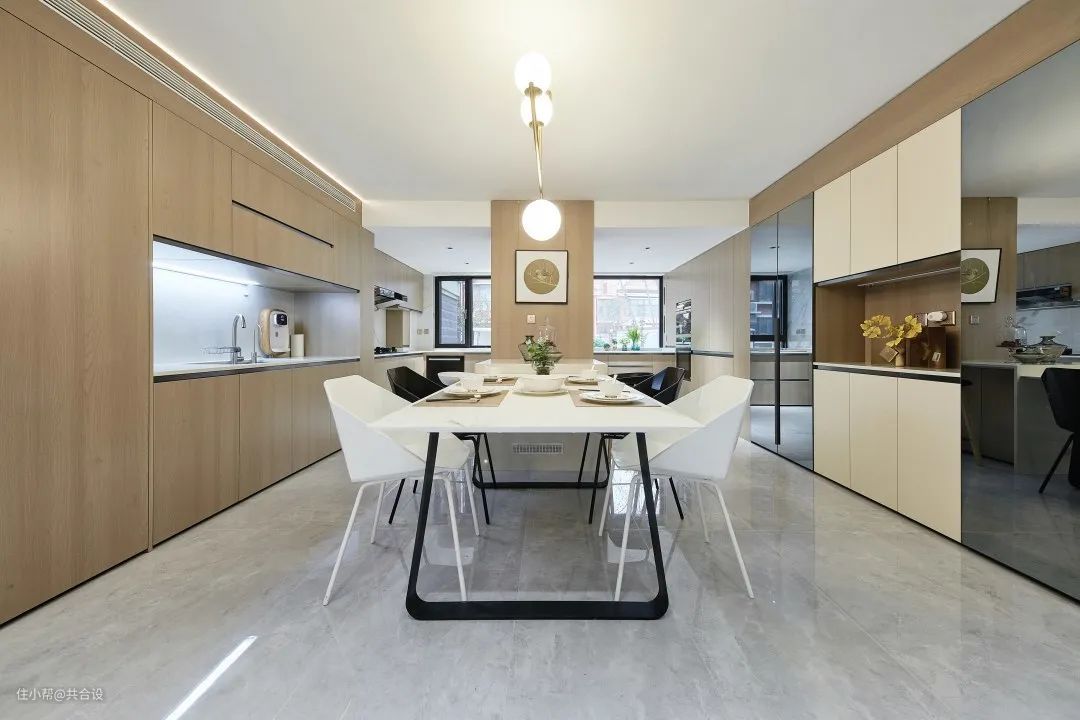 厨房和餐厅是设计师重点打造的空间,也是打造家的仪式感最重墨的地方。在设计师看来,好的开放式厨房应该是主空间的延展,与主空间和谐统一,在动线上也保持统一,让下厨成为一种家庭交流活动。设计师打破常规,将原来的一个厨房和一个小储物间的墙面拆除,合成一个中西开放式厨房。通过开放式的格局,增强了家庭成员的互动性与连通性,让业主在客厅就能看到在厨房中家人忙碌的身影,形成一种无声的交流。