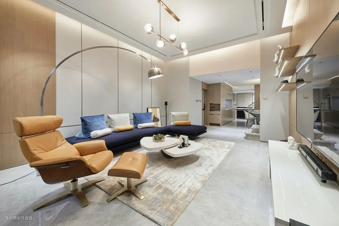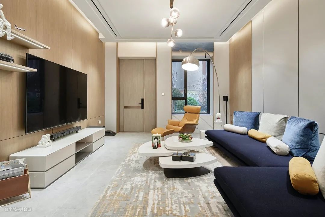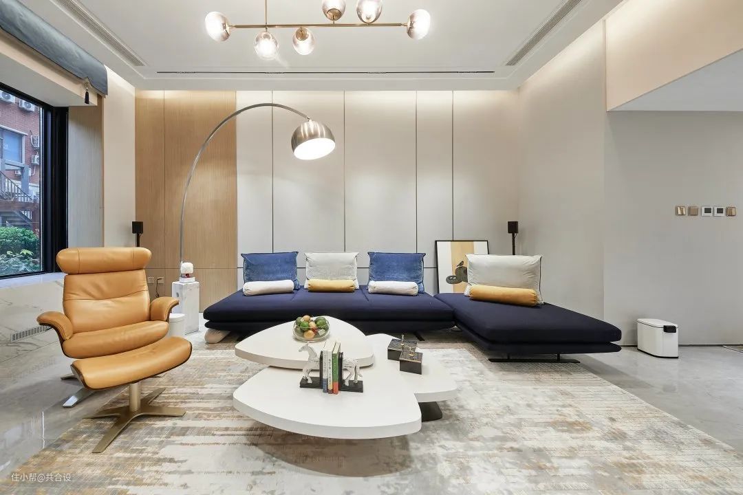 沙发和茶几的选择是这个空间的亮点,也是整个空间的亮色。蓝色+橙黄色沙发简约又灵动,可以随意摆放的沙发靠不仅改变了沙发的使用人数限制,也让这个区域的场景重构变得更加随心所欲,既能找到自己平时的专属位置,又方便家庭聚会时更多人的坐卧聚集。轻巧时尚、可以随意拆分组合的几何三角形茶几同样对空间的变换使用游刃有余。