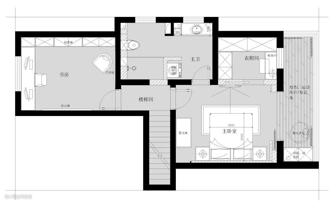 二楼的空间包括了一间卧室、一间书房、一个独立卫生间,是男主人自己的生活空间。此空间,设计师的匠心之处在于既考虑了男主人当下的个人爱好及生活习惯,又将空间进行了至少五年的前瞻设计,能够轻松应对未来家庭结构的变化。