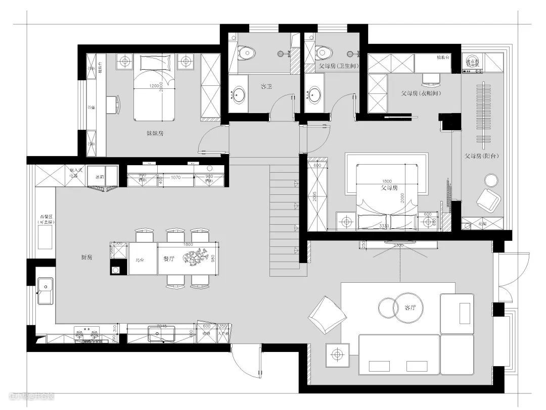一楼主要是父母和妹妹居住,并且作为主要活动空间和接待空间,所以整体设计思路要呈现出大气、通透、时尚的感觉,并运用家具搭配烘托出家的围炉精神。